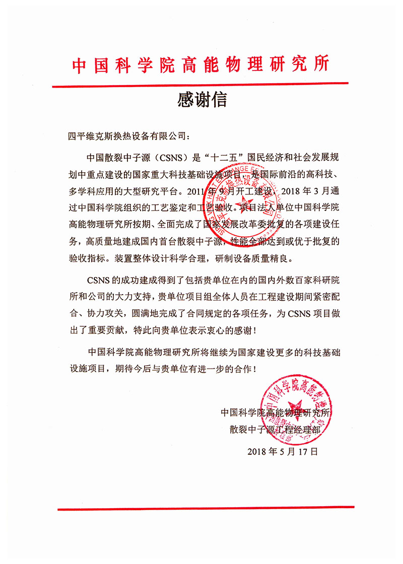 Thank you letter from Institute of high energy physics, Chinese Academy of Scien