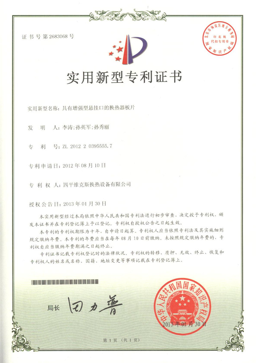 Patent certificate of heat exchanger plate with enhanced suspension port