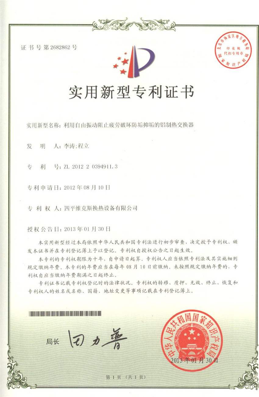 Patent certificate of aluminum heat exchanger for preventing fatigue damage, sca
