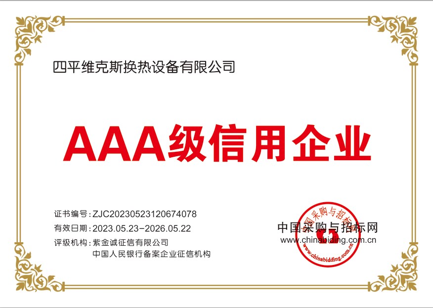 Siping Vickers Heat Exchanger Equipment Co., Ltd. obtained AAA-level enterprise 2023-05-23