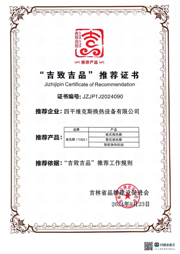 Siping Vickers Heat Exchange Equipment Co., Ltd. won the "Jizhi Jipin" 2024-10-09